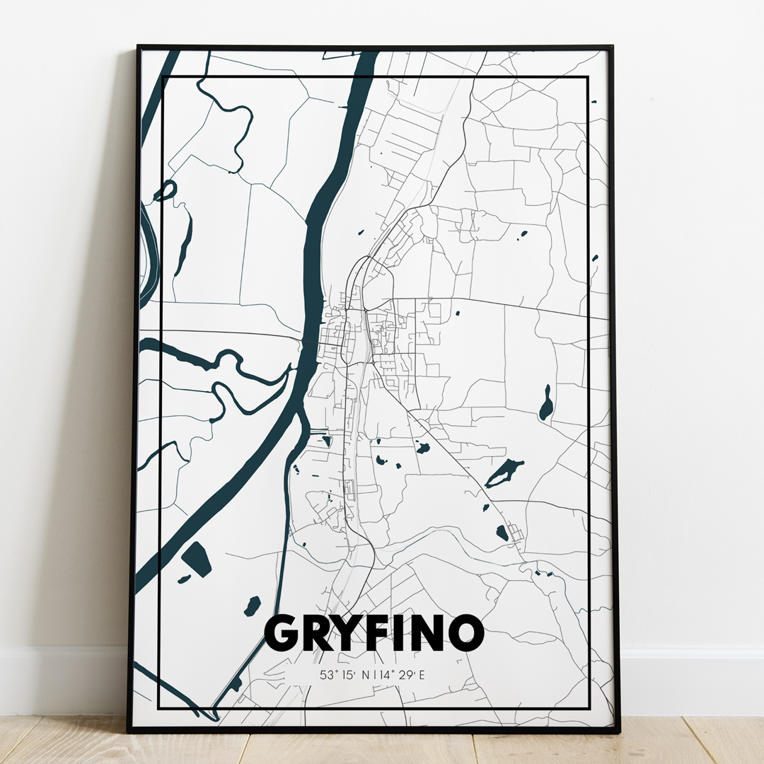 Klasyczna mapa Gryfina w kolorze białym.