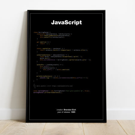 Plakat z językiem programowania JAVA SCRIPT, wydany w 1995 roku przez Brendan'a Eich'a. Odmiany języka JAVA SCRIPT były opracowywane przez firmę Netscape a sam język na początku został nazwany LiveScript. Plakat przedstawia kod, który przyjmuje zdanie wejściowe "More give posters me" po czym usuwa kapitalizację pierwszej litery, sortuje wyrazy alfabetycznie, dodaje na końcu wykrzyknik oraz emotkę, formatuje tekst. Efektem końcowym jest zdanie *** Give me more posters! :) ***.