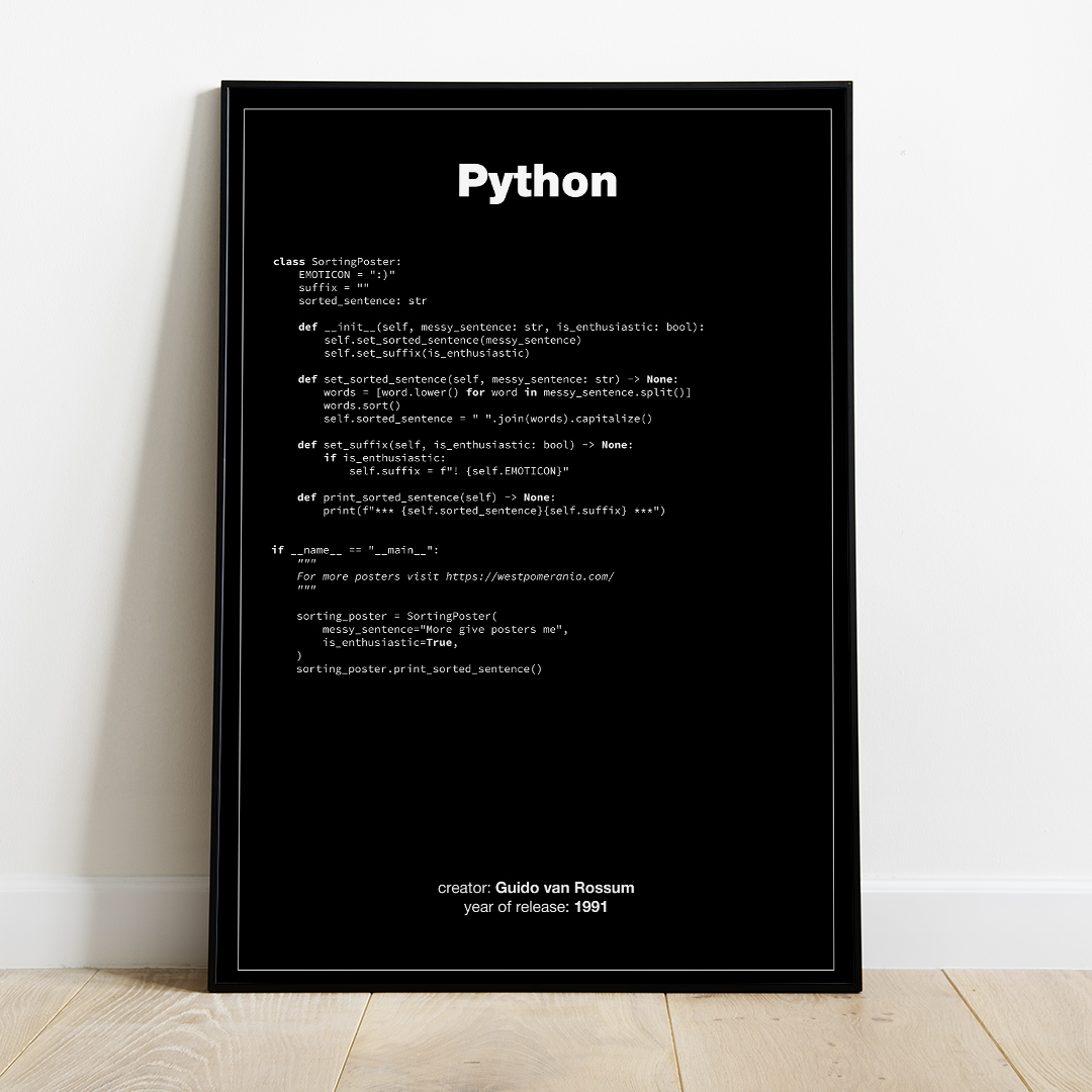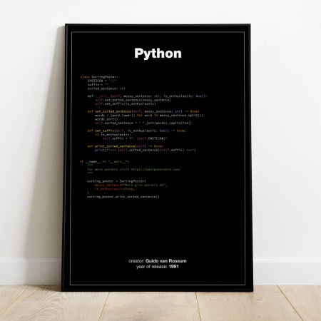 Plakat z językiem programowania Python, wydany w 1991 roku przez Guido van Rossum. Plakat przedstawia kod, który przyjmuje zdanie wejściowe "More give posters me" po czym usuwa kapitalizację pierwszej litery, sortuje wyrazy alfabetycznie, dodaje na końcu wykrzyknik oraz emotkę, formatuje tekst. Efektem końcowym jest zdanie *** Give me more posters! :) ***.